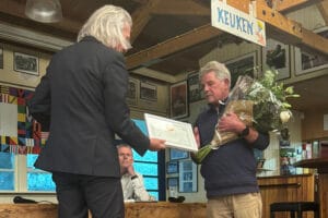 Donald Köller zien we af en toe nog wel voorbij schuifelen, maar in het ‘verleden’ was hij erg actief in het (jeugd)bestuur. Op de foto overhandigt kersverse voorzitter John de oorkonde met bloemen.