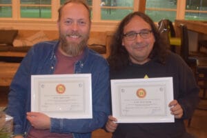 Twee teamgenoten kunnen elkaar de hand geven met hun 25 jarig jubileum. Ze zijn beide ook nog actief voetballer in de O35+. Van penningmeester Alex ontvingen Marvin Huizing en Stephan Kuster hun oorkonde en bloemen.
