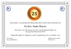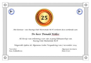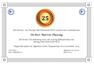 De jaarlijkse Algemene Leden Vergadering is altijd het moment om aandacht te geven aan onze trouwe leden en ook op 7 november 2024 had RCH weer een aantal jubilarissen en bijzonder dit keer was het feit dat de 4 jubilarissen 25 lid van RCH zijn.