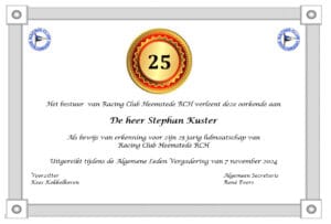 André Brasser kon helaas niet aanwezig zijn op de ALV, maar ook hij krijgt een oorkonde met het mooie 25-jarige jubileum. André is nog actief voetballer op de vrijdagavond bij de 7×7.