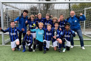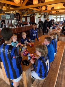 De champagne werd geopend en de beker in ontvangst genomen. Jeroen trakteerde de jongens nog op een lekker drankje en hapje in de kantine.