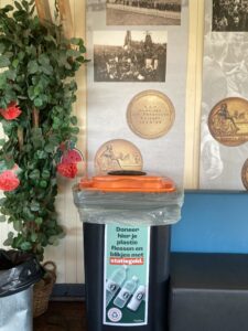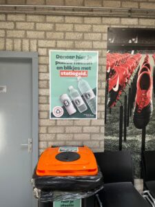 Sinds kort staat er in de kantine en in de ‘oude kleedkamers’ een container om plastic statiegeld flessen en blikjes in te gooien.