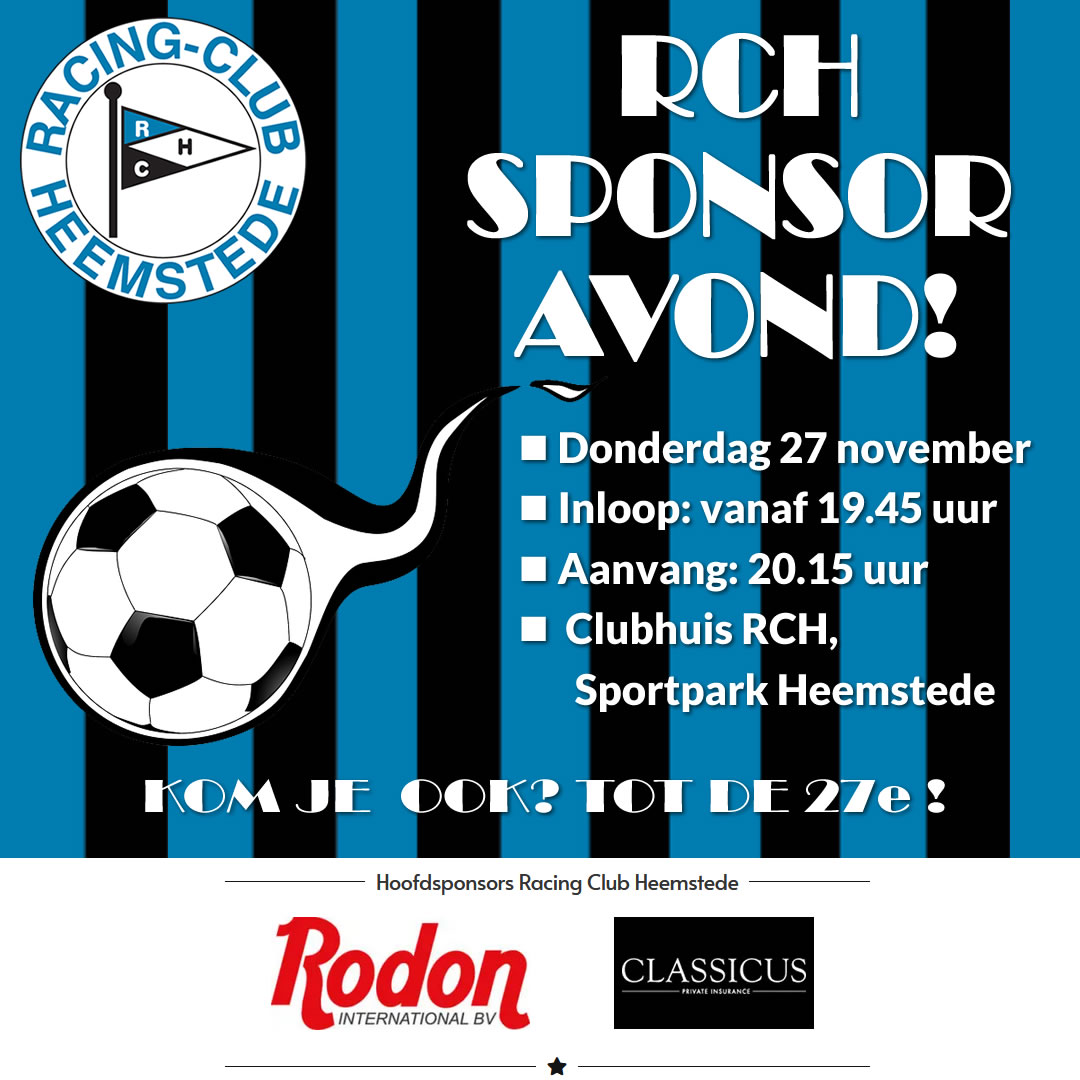 De sponsorcommissie van RCH Heemstede nodigt jullie van harte uit voor een inspirerende en gezellige sponsoravond in ons clubhuis.
