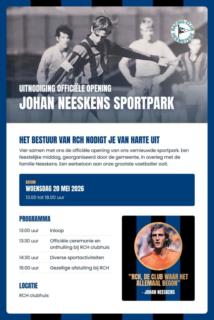 Vier samen met ons de officiële opening van ons vernieuwde sportpark. Een feestelijke middag, georganiseerd door de gemeente, in overleg met de familie Neeskens. Een eerbetoon aan onze grootste voetballer ooit.