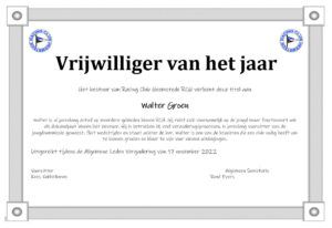 Naast de jubilarissen wordt er ook jaarlijks een vrijwilliger gekozen tijdens de Algemene Ledenvergadering en dat is best een lastige keus met de vele vrijwilligers in huis. Overigens hebben we er nooit genoeg. De one-liner “Een vereniging kan niet zonder vrijwilligers” geldt voor welke vereniging dan ook en ook bij RCH kunnen we niet zonder.